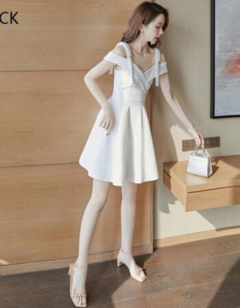 KM CK 宴会气质平时可穿显瘦吊带一字肩连衣裙白色小晚礼服裙