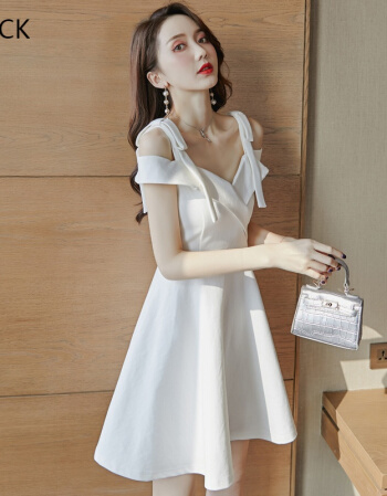 > KM CK 宴会气质平时可穿显瘦吊带一字肩连衣裙白色小晚礼服裙